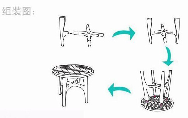 關(guān)于拼裝通過(guò)下面的示意圖可以看出基本的步驟。實(shí)際操作中首先是桌腿與桌撐的組合,通過(guò)預(yù)留的卡槽,首先手持桌撐將桌腿卡入,一次重復(fù)四次將四條桌腿安裝完畢。然后將桌面反向放置于平整地面,將組合好的桌腿與桌撐,對(duì)準(zhǔn)卡槽,推入四條桌腿,這樣一個(gè)完整的塑料桌子就組裝好了。拆卸過(guò)程同樣簡(jiǎn)單,指示把上述流程反向操作即可。